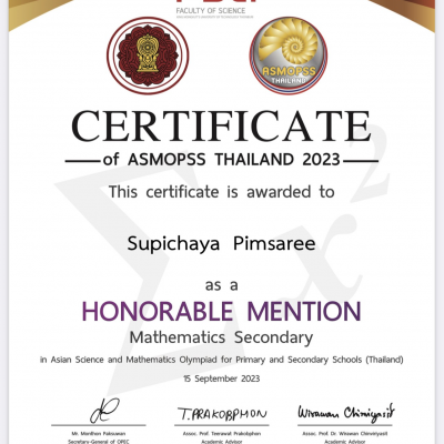 3. รางวัลชมเชยในการสอบแข่งขันวิชาคณิตศาสตร์ระดับชั้นมัธยมศึกษาตอนต้น : Honorable Mention Mathematics Secondary