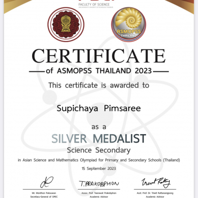 1. รางวัลเหรียญเงินในการสอบแข่งขันวิชาวิทยาศาสตร์ระดับชั้นมัธยมศึกษาตอนต้น : Silver Medalist Science Secondary