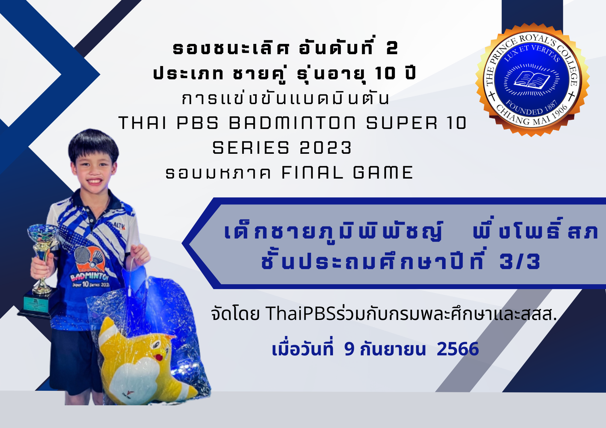 เด็กชายภูมิพิพัชญ์ พึ่งโพธิ์สภ ชั้นประถมศึกษาปีที่ 3/3 ได้รับรางวัลรองชนะเลิศ อันดับที่ 2 ประเภท ชายคู่ รุ่นอายุ 10 ปี แบดมินตันรายการThai PBS Badminton Super 10 Series 2023 รอบมหภาค Final Game