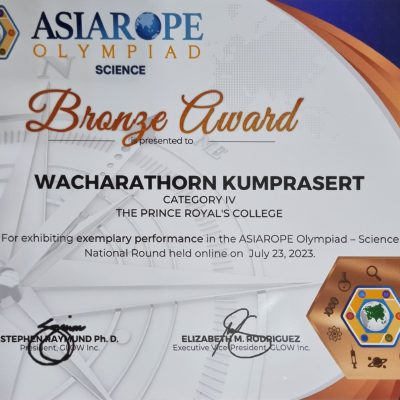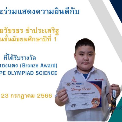 ขอชื่นชมและร่วมแสดงความยินดีกับเด็กชายวัชรธร ขำประเสริฐ นักเรียนชั้นมัธยมศึกษาปีที่ 1 ที่ได้รับรางวัลเหรียญทองแดง (Bronze Award) จากการแข่งขันรายการ ASIAROPE OLYMPIAD SCIENCE เมื่อวันที่ 23 กรกฎาคม 2566