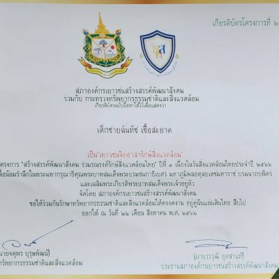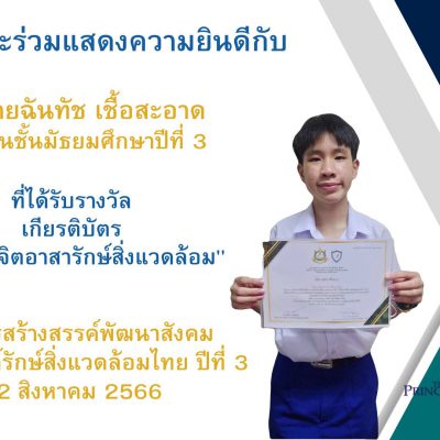 ขอชื่นชมและร่วมแสดงความยินดีกับเด็กชายฉันทัช เชื้อสะอาด นักเรียนชั้นมัธยมศึกษาปีที่ 3 ที่ได้รับรางวัลเกียรติบัตร”เยาวชนจิตอาสารักษ์สิ่งแวดล้อม” โครงการสร้างสรรค์พัฒนาสังคม ร่วมรณรงค์รักษ์สิ่งแวดล้อมไทย ปีที่ 3 เนื่องในวันสิ่งแวดล้อมไทยประจำปี 2566 เพื่อน้อมรำลึกในพระมหากรุณาธิคุณพระบาทสมเด็จพระบรมชนกาธิเบศร มหาภูมิพลอดุลยเดชมหาราช บรมนาถบพิตร และเฉลิมพระเกียรติพระบาทสมเด็จพระเจ้าอยู่หัว จัดโดย สภาองค์กรเยาวชนสร้างสรรค์พัฒนาสังคม ร่วมกับ กระทรวงทรัพยากรธรรมชาติและสิ่งแวดล้อม เมื่อวันที่ 22 เดือนสิงหาคม พ.ศ. 2566 ณ กรุงเทพมหานคร