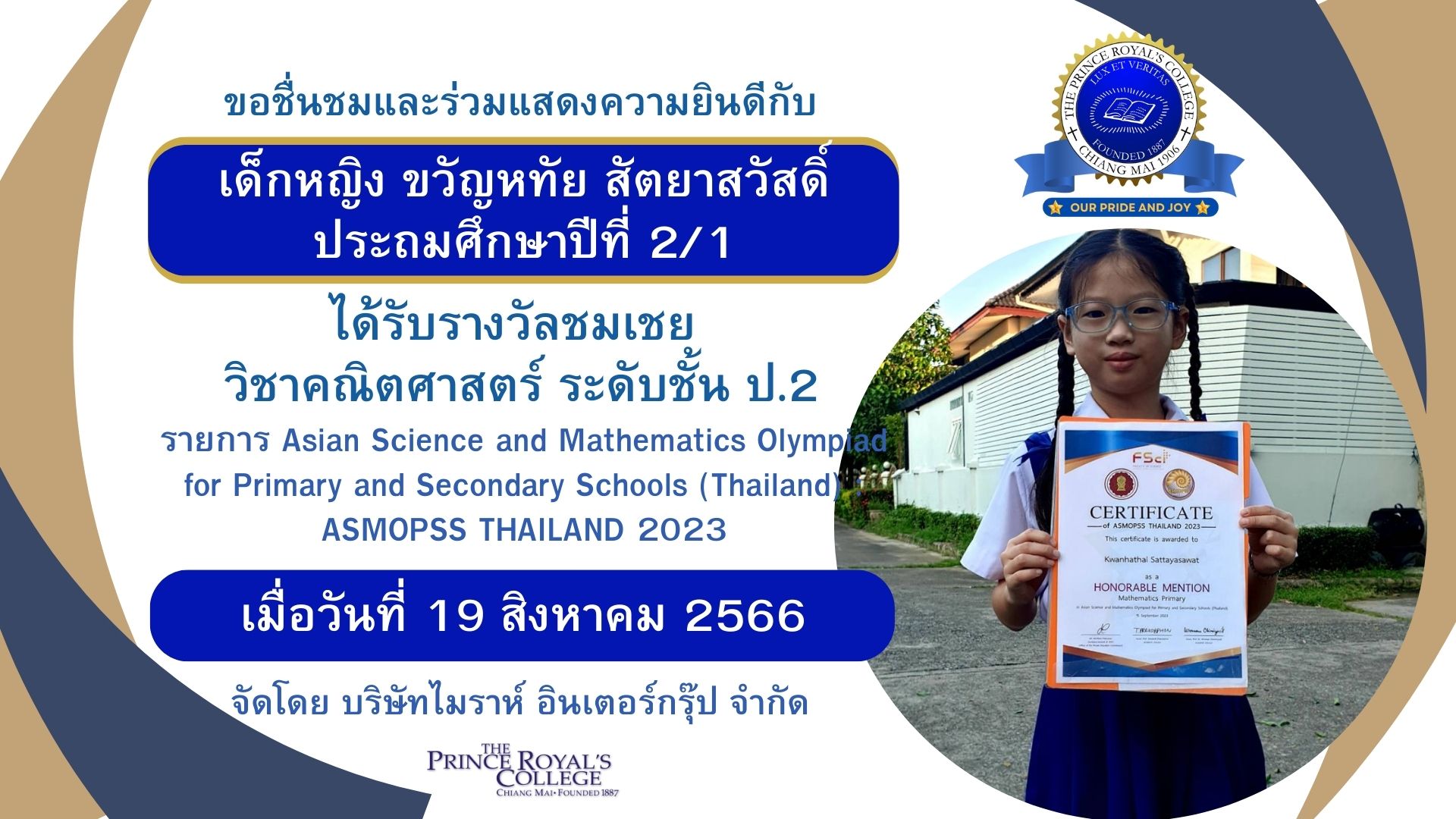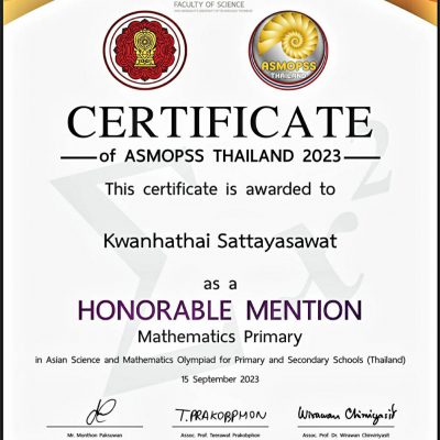ขอชื่นชมและร่มแสดงความยินดีกับ เด็กหญิงขวัญหทัย สัตยาสวัสดิ์ ชั้นประถมศึกษาปีที่ 2/1 ที่ได้รับรางวัลรางวัลชมเชย วิชาคณิตศาสตร์ ระดับชั้น ป.2 จากการแข่งขัน Asian Science and Mathematics Olympiad for Primary and Secondary Schools (Thailand) : ASMOPSS THAILAND 2023 โดย บริษัทไมราห์ อินเตอร์กรุ๊ป จำกัด ณ สนามสอบโรงเรียนอนุบาลเชียงใหม่ เมื่อวันที่ 19 สิงหาคม 2566