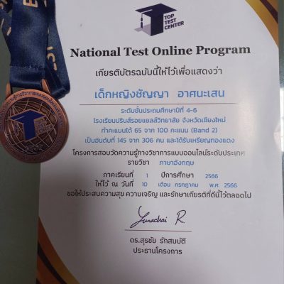 ที่ได้รับเหรียญทองแดงจากโครงการสอบวัดความรู้ทางวิชาการแบบออนไลน์รายวิชาภาษาอังกฤษ ระดับชั้นป.4-6 (ระดับประเทศ) National Test Online Program