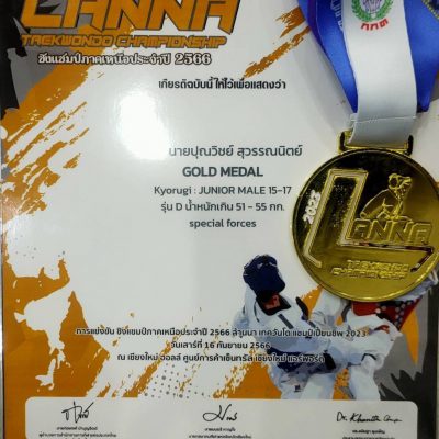 ทอง) ประเภทต่อสู้เยาวชนชาย  รุ่นอายุ 15 – 17 ปี  น้ำหนัก 51-55 กิโลกรัม  สังกัดทีม Special Forces   จากการแข่งขันเทควันโดชิงแชมป์ภาคเหนือ ประจำปี 2566  “ล้านนา เทควันโด แชมป์เปี้ยนชิพ 2023”  วันที่ 16 กันยายน พ.ศ.2566   ณ เชียงใหม่ ฮอลล์ ศูนย์การค้าเซ็นทรัล  เชียงใหม่ แอร์พอร์ต   จัดโดย สมาคมกีฬาแห่งจังหวัดเชียงใหม่