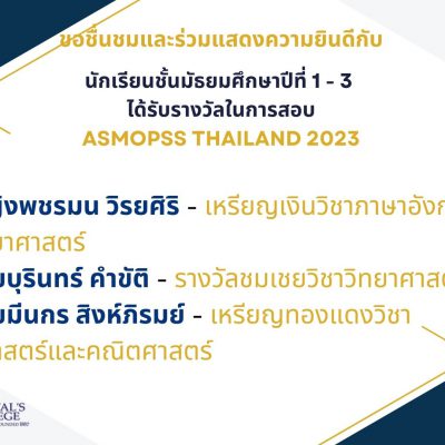 ขอชื่นชมและร่วมแสดงความยินดีกับ นักเรียนชั้นมัธยมศึกษาตอนต้น ที่ได้รับรางวัลจากการสอบแข่งขันวิทยาศาสตร์-คณิตศาสตร์ โอลิมปิก ASMOPSS (Asian Science & Mathematics Olympiad for Primary and Secondary Schools) โครงการสอบแข่งขันระดับนานาชาติ ASMOPSS ครั้งที่ 13 รอบความเป็นเลิศระดับประเทศ จัดโดยบริษัท ไมราห์ อินเตอร์ กรุ๊ป จำกัด ณ โรงเรียนอนุบาลเชียงใหม่ เมื่อวันที่ 19 สิงหาคม 2566