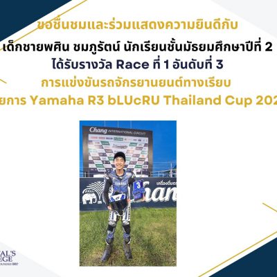 ขอชื่นชมและร่วมแสดงความยินดีกับ เด็กชายพศิน ชมภูรัตน์ นักเรียนชั้นมัธยมศึกษาปีที่ 2 ที่ได้รับรางวัลชนะเลิศอันดับที่ 3 Race ที่ 1 จากการแข่งขันรถจักรยานยนต์ทางเรียบ รายการ Yamaha R3 bLUcRU Thailand Cup 2023 สนามที่ 4 เมื่อวันที่ 22 กันยายน 2566 ณ สนาม ช้างอินเตอร์เนชั่นแนลเซอร์กิต จังหวัด บุรีรัมย์