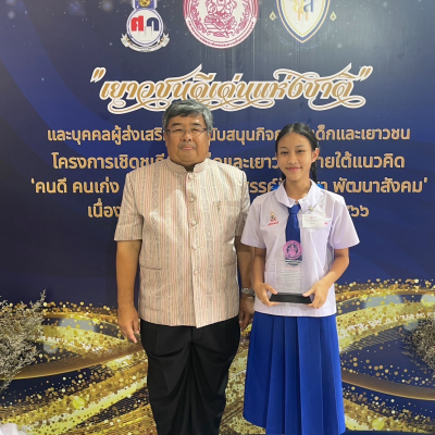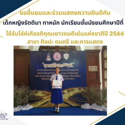 ขอชื่นชมและร่วมแสดงความยินดีกับเด็กหญิงรัตติมา ทาหนัก นักเรียนชั้นมัธยมศึกษาปีที่ 1 ที่ได้รับรางวัลโล่ประกาศเกียรติคุณ ในฐานะ เยาวชนดีเด่นแห่งชาติ ประจำปี 2566 สาขา ศิลปะ ดนตรี และการแสดง จากกระทรวงการพัฒนาสังคมและความมั่นคงของมนุษย์ ลงนามโดยท่านอนุกุล ปืดแก้ว ปลัดกระทรวงการพัฒนาสังคมและความมั่นคงของมนุษย์ จัดโดย สภาองค์กรเยาวชนสร้างสรรค์พัฒนาสังคม และได้รับเกียรติจากท่านอนันต์ ดนตรีหัวหน้าผู้ตรวจราชการกระทรวงการพัฒนาสังคมและความมั่นคงของมนุษย์เป็นประธานในพิธี และมอบโล่เกียรติคุณให้แก่เยาวชนดีเด่น ณ สมาคมธรรมศาสตร์ในพระบรมราชูปถัมภ์ เมื่อวันที่ 20 กันยายน 2566