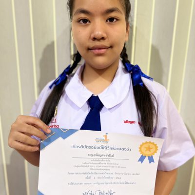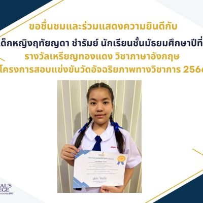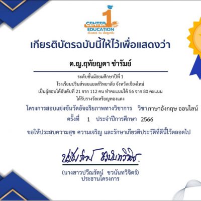 ขอชื่นชมและร่วมแสดงความยินดีกับ เด็กหญิงฤทัยญดา ชำรัมย์ นักเรียนชั้นมัธยมศึกษาปีที่ 1 ที่ได้รับรางวัลเหรียญทองแดง จากการแข่งขันวัดอัจฉริยภาพทางวิชาการวิชาภาษาอังกฤษ ครั้งที่ 1 ประจำปีการศึกษา 2566 (ระดับชั้น ม.1) จัดโดยบริษัทเซ็นเตอร์ วัน เอ็ดดูเคชั่น เมื่อวันที่ 9 กันยายน 2566 (สอบแบบ Online)