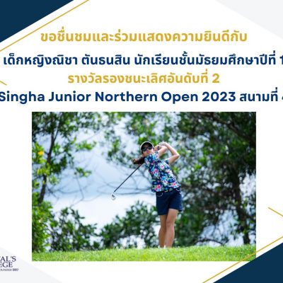 ขอชื่นชมและร่วมแสดงความยินดีกับ เด็กหญิงณิชา ตันธนสิน นักเรียนชั้นมัธยมศึกษาปีที่ 1 ที่ได้รับรางวัลรองชนะเลิศอันดับที่ 2 จากการแข่งขันกอล์ฟ รายการ Singha Junior Northern Open 2023 สนามที่ 4 ณ สนามกอล์ฟ กัซซัน พาโนรามา เมื่อวันที่ 1 ตุลาคม 2566