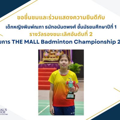 ขอชื่นชมและร่วมแสดงความยินดีกับ เด็กหญิงพิมพ์ณภา ธนัทอนันตพงศ์ นักเรียนชั้นมัธยมศึกษาปีที่ 1 ที่ได้รับรางวัลรองชนะเลิศอันดับ 2 ประเภทหญิงคู่ รุ่นอายุไม่เกิน 15 ปี จากการแข่งขันแบตมินตัน รายการ THE MALL Badminton Championship 2023 ชิงถ้วยพระราชทาน สมเด็จพระกนิษฐาธิราชเจ้า กรมสมเด็จพระเทพรัตนราชสุดาฯ สยามบรมราชกุมารี เก็บคะแนนสะสม ในระดับ LEVEL 2 ระหว่างวันที่ วันที่ 3 – 8 ตุลาคม 2566 ณ MCC HALL THE MALL จ.นครราชสีมา
