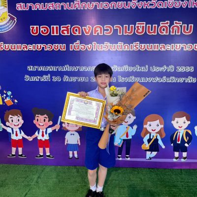 ขอชื่นชมและร่วมแสดงความยินดีกับ เด็กชาย ภูมิพิพัชญ์ พึ่งโพธิ์สภ ระดับชั้นประถมศึกษาปีที่ 3/3 ได้รับคัดเลือกเป็นนักเรียนดีเด่นในโอกาสวันเยาวชนแห่งชาติระดับชั้น ประถมปีที่ 1-3 ประจำปีพุทธศักราช 2566 จัดโดย สมาคมสถานศึกษาเอกชนจังหวัดเชียงใหม่ วันเสาร์ที่ 30 กันยายน 2566 ณ โรงเรียนมงฟอร์ตวิทยาลัย