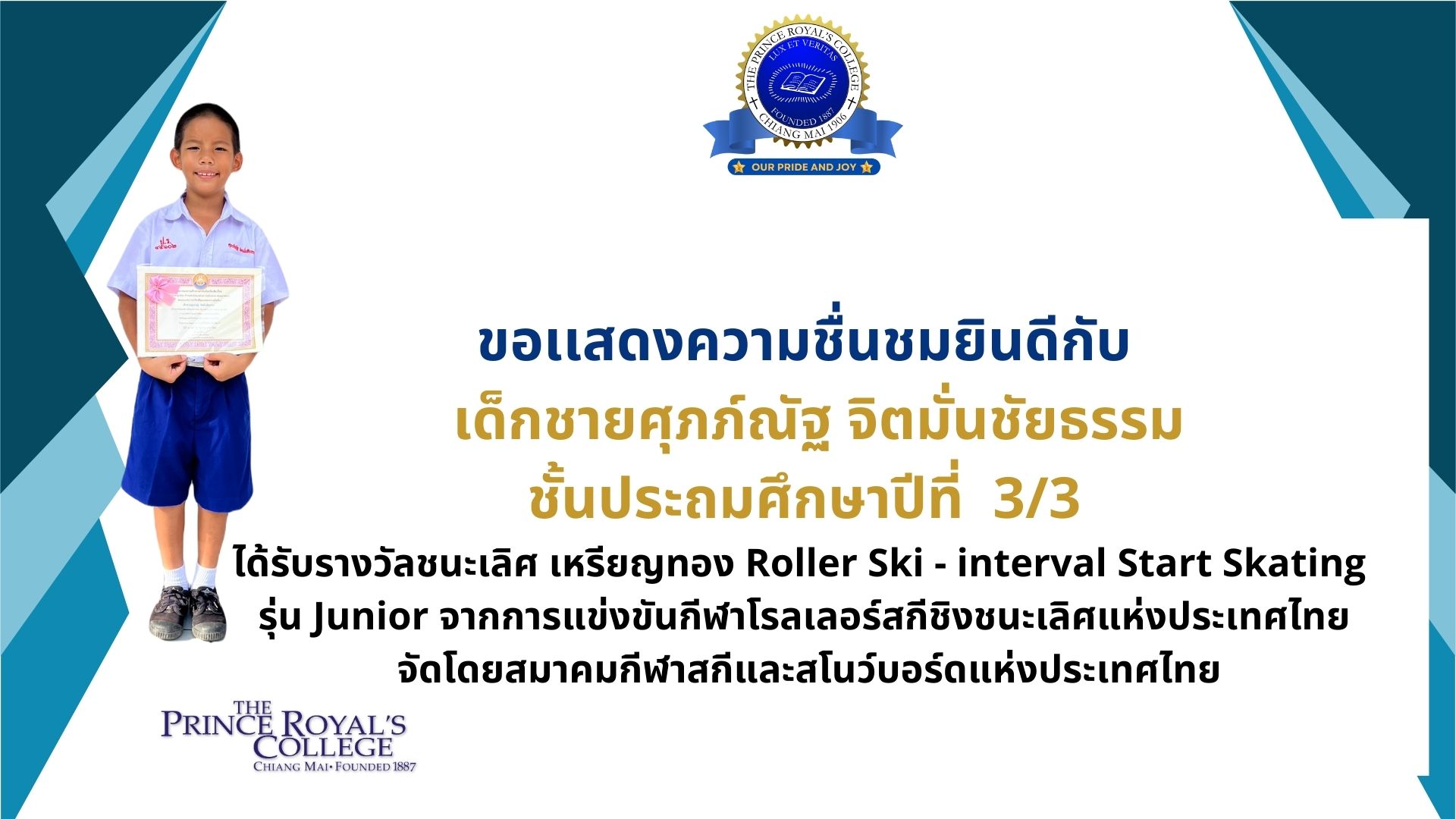 ขอชื่นชมและร่วมแสดงความยินดีกับ เด็กชายศุภภ์ณัฐ จิตมั่นชัยธรรม ระดับประถมศึกษาปีที่ 3/3 โรงเรียนปรินส์รอยแยส์วิทยาลัย ได้รับรางวัลชนะเลิศ เหรียญทอง Roller Ski – interval Start Skating รุ่น Junior จากการแข่งขันกีฬาโรลเลอร์สกีชิงชนะเลิศแห่งประเทศไทย จัดโดยสมาคมกีฬาสกีและสโนว์บอร์ดแห่งประเทศไทย