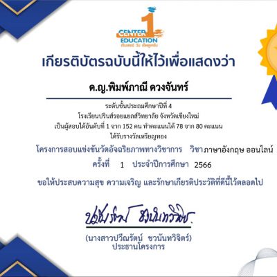 เป็นผู้สอบได้อันดับที่ 1 ทำคะแนนได้ 78 คะแนน จาก คะแนนเต็ม 80 คะแนน