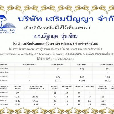 ขอชื่นชมและร่วมแสดงความยินดีกับเด็กชายณัฐกฤต ลุ่นเซียะนักเรียนระดับชั้นประถมศึกษาปีที่ 3/7 ที่ได้รับคะแนน รวม 67 จากคะแนนเต็ม80 ในการสอบแข่งขัน โครงการทดสอบความรู้วิชาภาษาอังกฤษครั้งที่ 38 สนามสอบกลาง จัดโดย “บริษัท เสริมปัญญา จำกัด เมื่อวันที่ 2กันยายน 2566