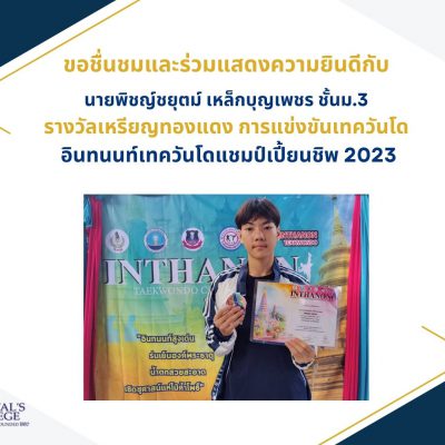 ขอชื่นชมและร่วมแสดงความยินดีกับ นายพิชญ์ชยุตม์ เหล็กบุญเพชร นักเรียนชั้นมัธยมศึกษาปีที่ 3 ที่ได้รับรางวัลรองชนะเลิศอันดับ 2 (เหรียญทองแดง) รุ่นอายุ 15 – 17 ปี ชาย น้ำหนัก 51 – 55 กิโลกรัม จากการแข่งขันเทควันโด รายการอินทนนท์เทควัณโดแชมป์เปี้ยนชิพ 2023 ณ หอประชุมอินทนนท์โรงเรียนมัธยมจอมทองจ.เชียงใหม่ เมื่อวันที่ 21 ตุลาคม 2566