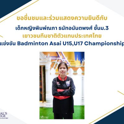 ขอชื่นชมและร่วมแสดงความยินดีกับ เด็กหญิงพิมพ์ณภา ธนัทอนันตพงศ์ นักเรียนชั้นมัธยมศึกษาปีที่ 1 ที่ได้เป็นตัวแทนเยาวชนทีมชาติประเทศไทย เข้าร่วมแข่งขันรายการ Badminton Asai U15,U17 Championship 2023 ณ เมืองเฉินตู สาธารณะรัฐประชาชนจีน ระหว่างวันที่ 17 – 22 ตุลาคม 2566