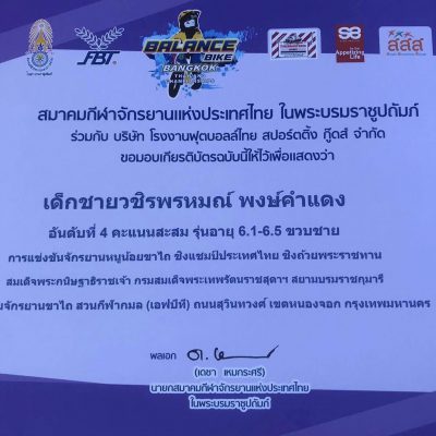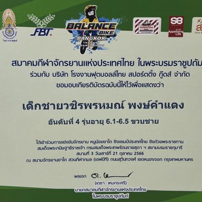 ได้รับรางวัล รางวัลคะแนนรวมสะสม ได้ถ้วยพระราชทาน อันดับ 4 ของประเทศ รุ่นอายุ 6.1-6.5 ปี ชาย