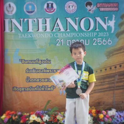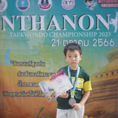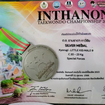 ได้รับรางวัล รองชนะเริดอันดับ1 เหรียญเงิน เคียวรูกิ คลาส B 20-23 kg INTHANON TAEKWONDO CHAMPIONSHIP 2023