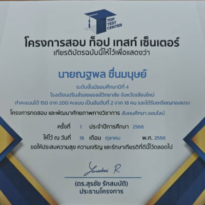 ขอชื่นชมและแสดงความยินดีกับ นายณฐพล  ชื่นมนุษย์  ม.4/11  ที่ได้รับรางวัลเหรียญทองแดง เป็นอันดับที่ 2  จาก 18 คน  จากโครงการทดสอบและพัฒนาศักยภาพทางวิชาการสังคมศึกษา ออนไลน์   เมื่อวันที่ 16 ตุลาคม  2566  จัดโดย โครงการสอบ ท็อป เทสท์ เซ็นเตอร์
