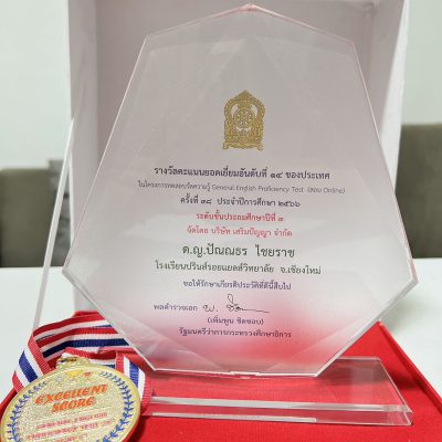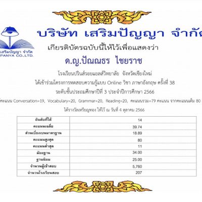 ขอชื่นชมและร่วมแสดงความยินดีกับ เด็กหญิงปัณณธร ไชยราช ระดับชั้นประถมศึกษาปีที่ 3/1 ได้รับรางวัลเหรียญทอง จากการทดสอบความรู้แบบ online วิชาภาษาอังกฤษ ครั้งที่ 38 ประจำปีการศึกษา 2566 โดยได้คะแนน 79 คะแนน จากคะแนนเต็ม 80 คะแนน จัดโดย บริษัท เสริมปัญญา จำกัด
