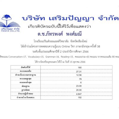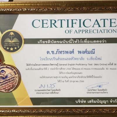 ขอชื่นชมและร่วมแสดงความยินดีกับ เด็กชายภัทรพงศ์ พงศ์มณี ชั้นประถมศึกษาปีที่ 2/3 ที่ได้รับรางวัลเหรียญทองแดง วิชาภาษาอังกฤษระดับชั้นประถมศึกษาปีที่ 2 ปีการศึกษา 2566 จากโครงการทดสอบความรู้ภาษาอังกฤษ ออนไลน์ ครั้งที่ 38 จัดโดยบริษัทเสริมปัญญา เมื่อวันที่ 18 ตุลาคม 2566
