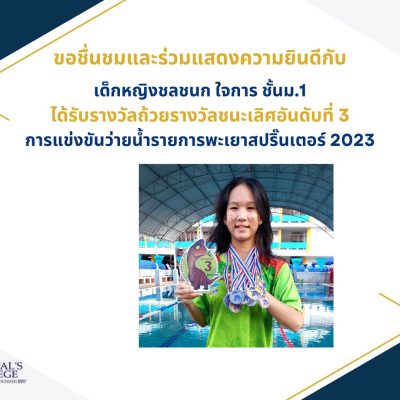 ขอชื่นชมและร่วมแสดงความยินดีกับ เด็กหญิงชลชนก ใจการ นักเรียนชั้นมัธยมศึกษาปีที่ 1 ที่ได้รับรางวัลถ้วยรางวัลชนะเลิศอันดับที่ 3 รุ่น 13 ปี หญิง และเหรียญรางวัล