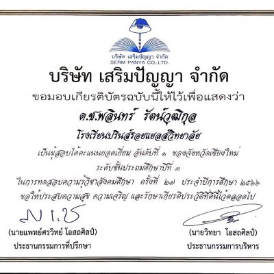 ขอชื่นชมและร่วมแสดงความยินดีกับ เด็กชายพลินทร์ รัตน์วุฒิกุล ชั้นประถมศึกษาปีที่ 3/4 ที่ได้รับรางวัลผลคะแนนยอดเยี่ยม อันดับที่ 1 ของจังหวัดเชียงใหม่ ระดับชั้นประถมศึกษาปีที่3