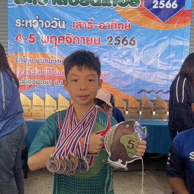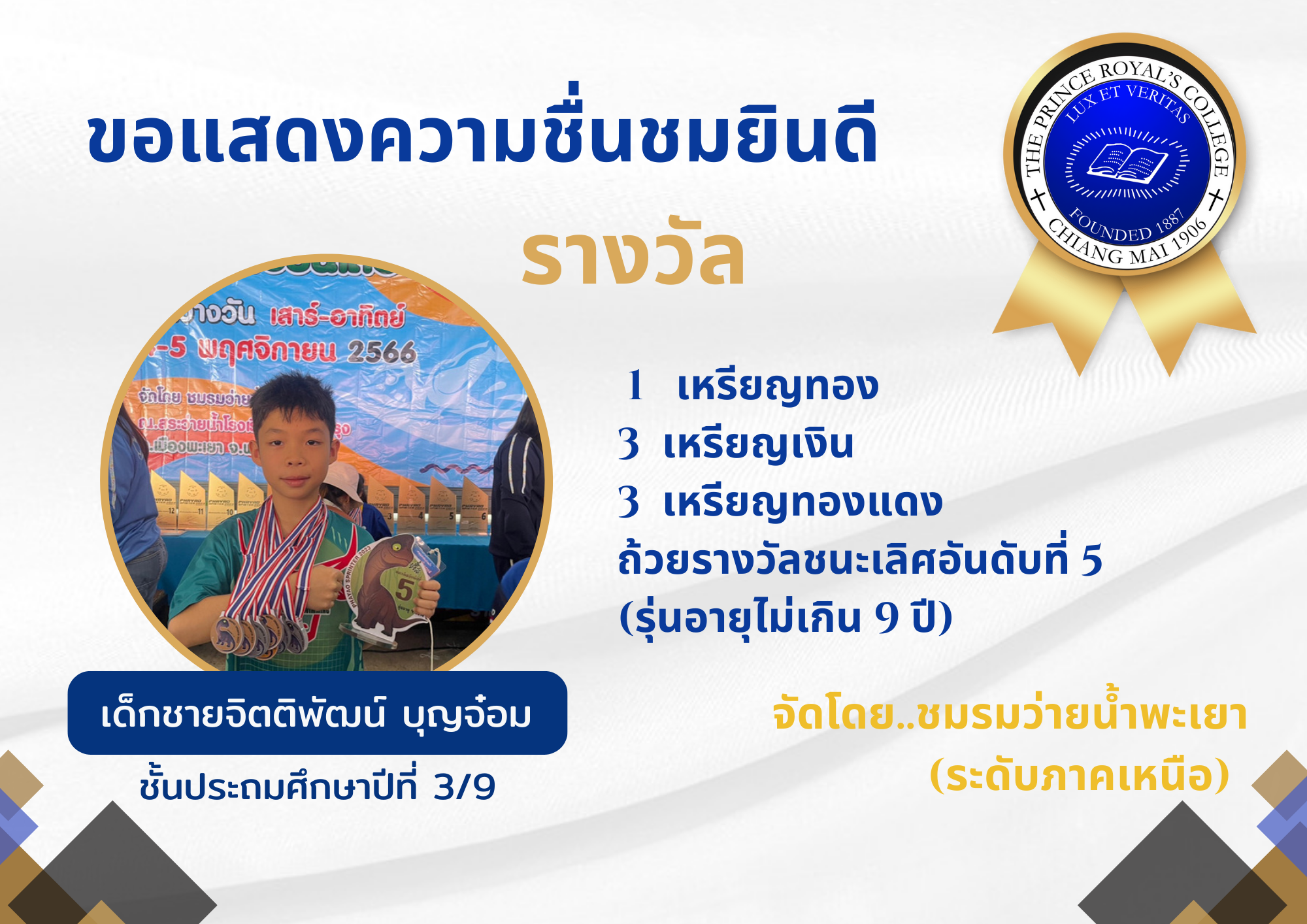 1 เหรียญทอง 3 เหรียญเงิน และ 3 เหรียญทองแดง รายการที่ไปแข่ง พะเยาสปริ้นเตอร์ ปี 2566 จัดโดยชมรมว่ายน้ำพะเยา เมื่อวันที่ 4 – 5 พฤศจิกายน 2566 (ระดับภาคเหนือ)