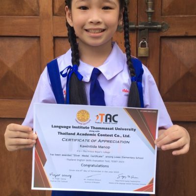ขอชื่นชมและร่วมแสดงความยินดีกับ เด็กหญิงกวินธิดา มานพ ชั้นประถมศึกษาปีที่ 3/6 ที่ได้รับรางวัลเกียรติบัตรเหรียญเงิน จากการสอบแข่งขันทักษะภาษาอังกฤษ TESET (Thailand English Skills Evaluation Test) โครงการประเมินทักษะทางภาษาอังกฤษระดับประเทศ ครั้งที่ 4 ประจำปี 2566(ระดับประเทศ) จัดโดยถาบันอคาเดมิค คอนเทสต์ ประเทศไทย TAC (Thailand Academic Contest) เมื่อวันที่ 6 พฤศจิกายน 2566