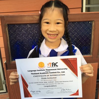 ขอชื่นชมและร่วมแสดงความยินดีกับ เด็กหญิงภีรดา สมบัตินันท์ ชั้นประถมศึกษาปีที่ 3/13 ที่ได้รับรางวัลเกียรติบัตรเหรียญทองแดง จากการสอบแข่งขันทักษะภาษาอังกฤษ TESET (Thailand English Skills Evaluation Test) โครงการประเมินทักษะทางภาษาอังกฤษระดับประเทศ ครั้งที่ 4 ประจำปี 2566(ระดับประเทศ) จัดโดยถาบันอคาเดมิค คอนเทสต์ ประเทศไทย TAC (Thailand Academic Contest) เมื่อวันที่ 20 สิงหาคม 2566