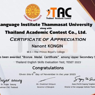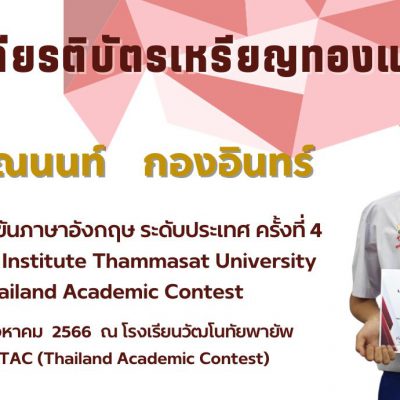 ขอชื่นชมและแสดงความยินดีกับ นายณนนท์ กองอินทร์ ม.5/2 ที่ได้รับรางวัล “Bronze Medal Certificate” จากการแข่งขันภาษาอังกฤษ ระดับประเทศ Language Institute Thammasat University Thailand Academic Contestครั้งที่ 4 เมื่อวันอาทิตย์ที่ 20 สิงหาคม 2566 ณ โรงเรียนวัฒโนทัยพายัพ จังหวัดเชียงใหม่ จัดโดย TAC (Thailand Academic Contest)