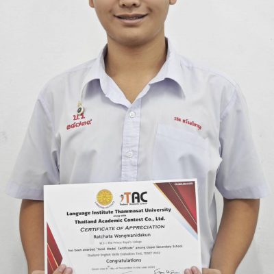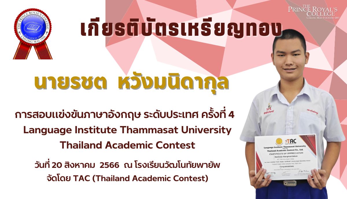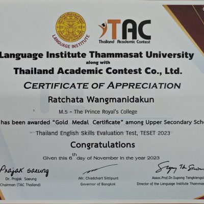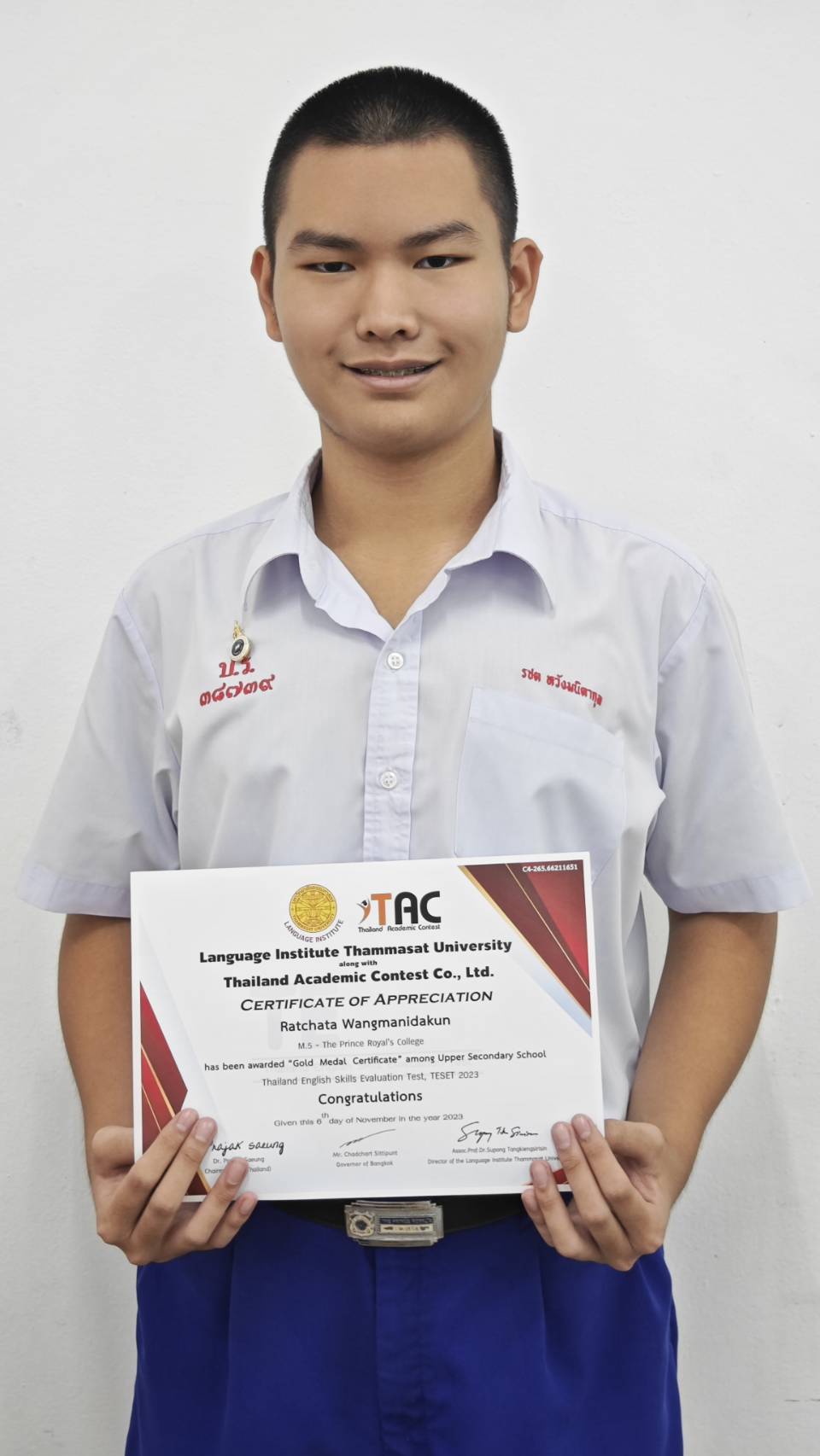 ขอชื่นชมและแสดงความยินดีกับ นายรชต หวังมนิดากุล ม.5/9 ที่ได้รับรางวัลเหรียญทอง ระดับมัธยมศึกษาตอนปลาย จากโครงการประเมินทักษะภาษาอังกฤษระดับประเทศ (TESET) ครั้งที่ 4 เมื่อวันที่ 20 สิงหาคม 2566 ณ โรงเรียนวัฒโนทัยพายัพ จัดโดย TAC (Thailand Academic Contest)
