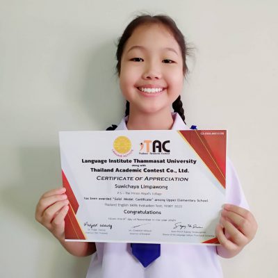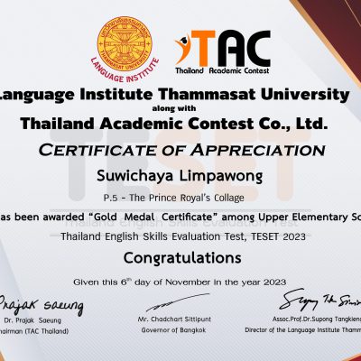ที่ได้รับเกียรติบัตรเหรียญทอง จากโครงการประเมินทักษะภาษาอังกฤษระดับประเทศ ครั้งที่ 4 4th Thailand English Skills Evaluation Test (TESET) จัดโดย จัดโดย TAC (Thailand Academic Contest) บริษัท อคาเดมิค คอนเทสต์ (ประเทศไทย) จำกัด