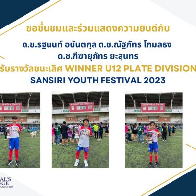 ขอชื่นชมและร่วมแสดงความยินดีกับ เด็กชายรฐนนท์ อนันตกุล เด็กชายณัฐภัทร โกมลธง และเด็กชายฑีฆายุภัทร ยะสุนทร นักเรียนชั้นมัธยมศึกษาปีที่ 1 ที่ได้รับรางวัลชนะเลิศ “WINNER U12 PLATE DIVISION 1” จากการแข่งขันฟุตบอล 7 คน รายการ SANSIRI YOUTH FESTIVAL 2023 ณ โรงเรียนอัสสัมชัญกรุงเทพธนบุรีระหว่างวันที่ 11 – 12 พฤศจิกายน 2566
