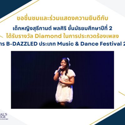 ขอชื่นชมและร่วมแสดงความยินดีกับ เด็กหญิงสุธีกานต์ พลศิริ นักเรียนชั้นมัธยมศึกษาปีที่ 2 เป็นตัวแทนประเทศไทยเข้าร่วมการแข่งขันประกวดร้องเพลง ได้รับถ้วยรางวัล Diamond พร้อมประกาศนียบัตร ในรายการ B-DAZZLED ประเภท Music & Dance Festival 2023 ระหว่างวันที่ 8-9 พฤศจิกายน 2566 ณ Capital Theater ประเทศสิงคโปร์