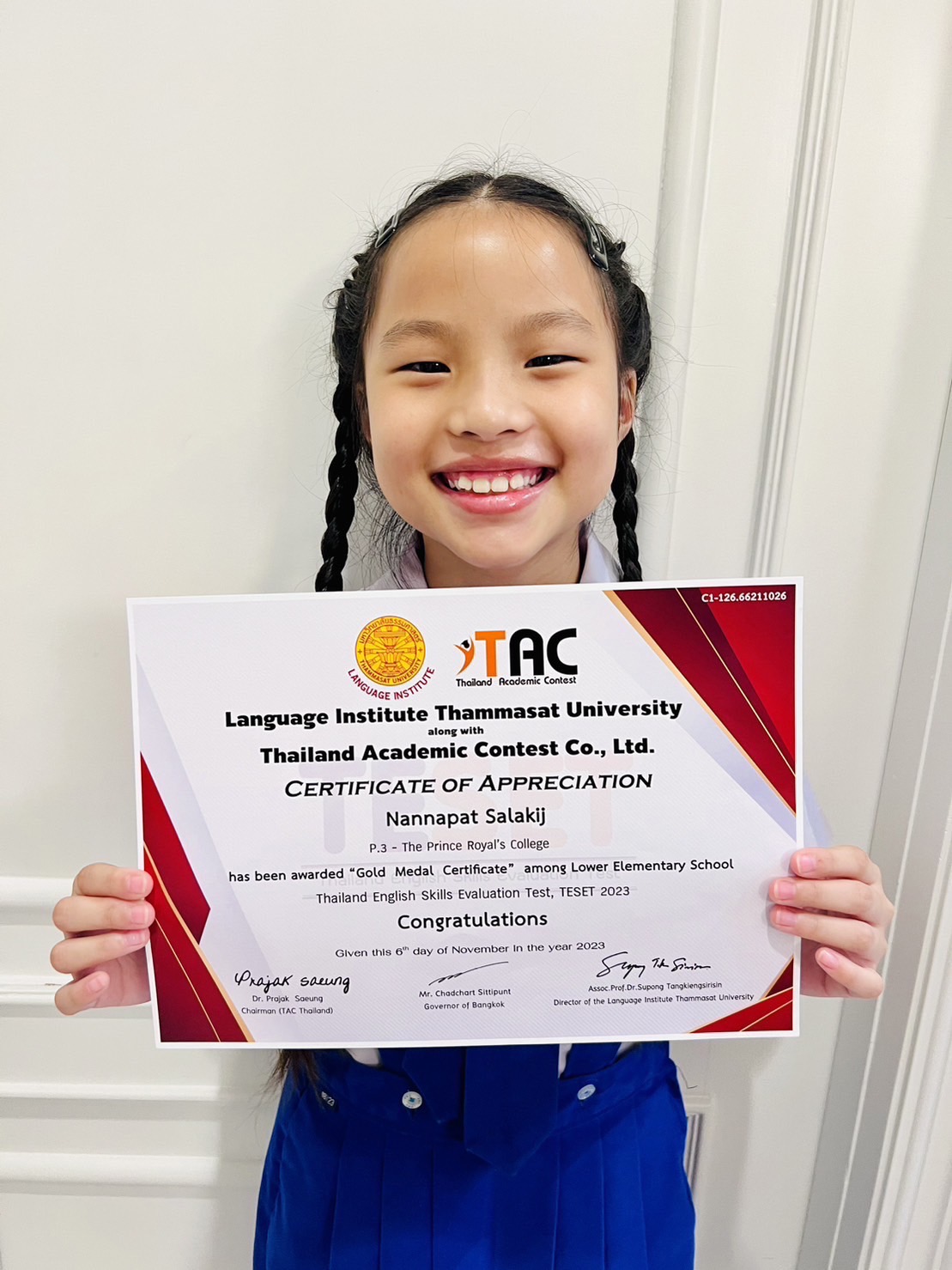 ขอชื่นชมและร่วมแสดงความยินดีกับเด็กหญิงนันนพัทธ ศาลากิจ ชั้นประถมศึกษาปีที่ 3 ที่ได้รับรางวัลเกียรติบัตรเหรียญทอง(ระดับประเทศ) รายการสอบแข่งขันโครงการประเมินทักษะภาษาอังกฤษ ระดับประเทศ (TESET) ร่วมกับสถาบันภาษามหาวิทยาลัยธรรมศาสตร์ ครั้งที่ 4 Thailand English Skills Evaluation Test, TESET 2023 ระดับประถมศึกษาตอนต้น จัดโดย ศูนย์สอบวิชาการ (ประเทศไทย) สถาบัน TAC บริษัท อคาเดมิค คอนเทสต์ (ประเทศไทย) ณโรงเรียนวัฒโนทัยพายัพ เมื่อวันที่ 6 พฤศจิกายน 2566