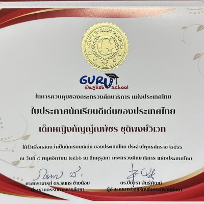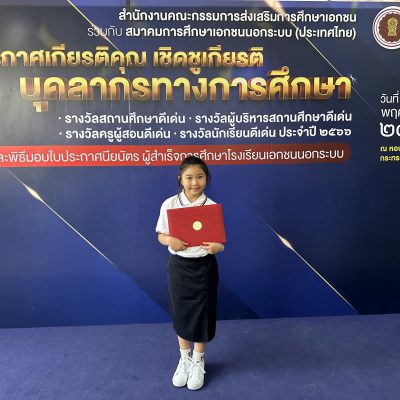 ขอชื่นชมและร่วมแสดงความยินดีกับเด็กหญิงกัญญ์ณพัชร ชุติพงษ์วิเวท ชั้นประถมศึกษาปีที่ 3 ที่ได้รับรางวัลใบประกาศนียบัตรนักเรียนดีเด่นของประเทศไทยประจำปี 2566 จากสำนักงานส่งเสริมการศึกษาเอกชน กระทรวงศึกษาธิการ ร่วมกับสมาคมการศึกษาเอกชนนอกระบบ ( ประเทศไทย ) ณ หอประชุมคุรุสภา กระทรวงศึกษาธิการ เมื่อวันที่ 5 พฤศจิกายน 2566