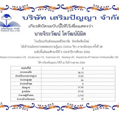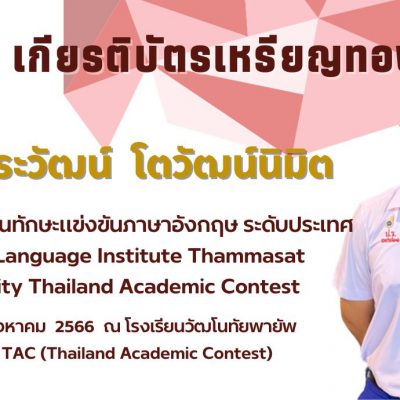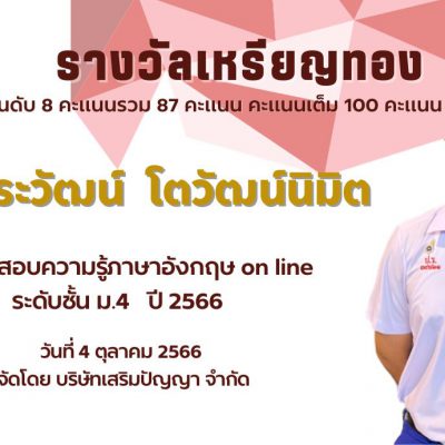 – รางวัลเหรียญทอง ระดับประเทศ อันดับ 8 คะแนนรวม 87 คะแนน จากคะแนนเต็ม 100 คะแนน จาก โครงการทดสอบความรู้แบบ on line วิชาภาษาอังกฤษ ครั้งที่ 38 ระดับชั้น ม.4 ปี 2566 วันที่ 4 ตุลาคม 2566 จัดโดย บริษัทเสริมปัญญา จำกัด