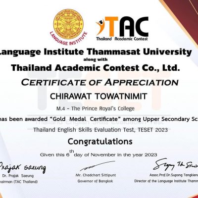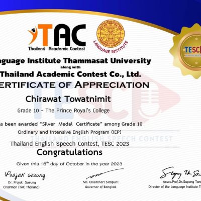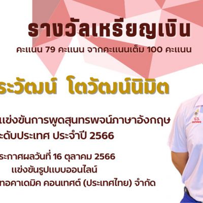 – รางวัลเหรียญเงิน ระดับชั้นมัธยมศึกษาตอนปลาย คะแนน 79 คะแนน จากคะแนนเต็ม 100 คะแนน โครงการแข่งขันการพูดสุนทรพจน์ภาษาอังกฤษระดับประเทศ ประจำปี พ.ศ. 2566 TESC : Thailand English Speech Contest 2023 หัวข้อ “Dream careers and participation of the new generation in shaping the future of Thailand” อาชีพในฝันและการมีส่วนร่วมของคนรุ่นใหม่ในการสร้างอนาคตประเทศไทย วันที่ 16 ตุลาคม 2566