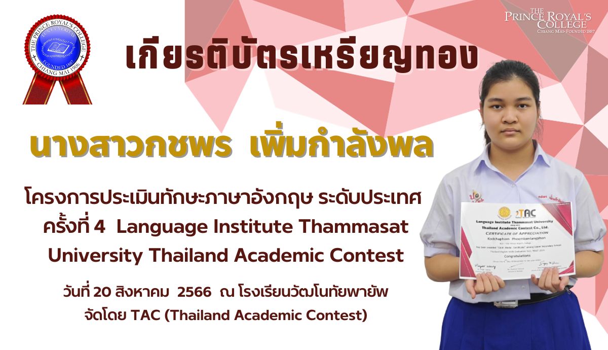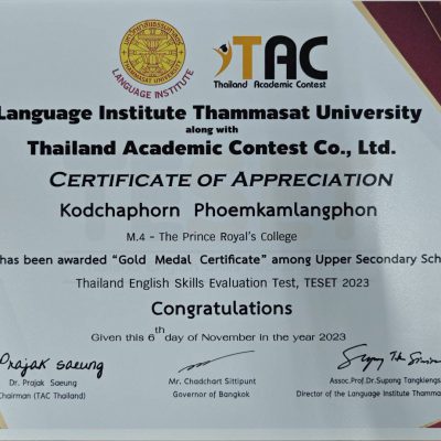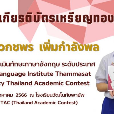 ขอชื่นชมและแสดงความยินดีกับ นางสาวกชพร เพิ่มกำลังพล ม.4/3 ที่ได้รับเกียรติบัตรรางวัล Gold Medal Certificate ระดับมัธยมศึกษาตอนปลาย จากการเข้าร่วมแข่งขันโครงการประเมินทักษะภาษาอังกฤษระดับประเทศ (TESET) ครั้งที่ 4 เมื่อวันที่ 20 สิงหาคม 2566 ณ โรงเรียนวัฒโนทัยพายัพ จัดโดย ศูนย์สอบวิชาการ(ประเทศไทย) คอนเทสต์ สถาบัน TAC