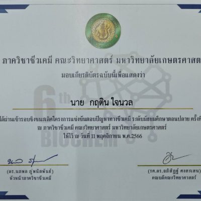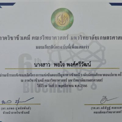 ขอชื่นชมและแสดงความยินดีกับ นางสาวพอใจ พงศ์ศรีวัฒน์ ม.5/3 และ นายกฤติณ ใจนวล ม.5/5 ที่ได้รับรางวัลชมเชย ระดับประเทศ จากกิจกรรม 6th Biochem Challenge โครงการแข่งขันตอบปัญหาทางชีวเคมี ระดับมัธยมศึกษาตอนปลาย ครั้งที่ 6 วันที่ 11 พฤศจิกายน 2566 ณ คณะวิทยาศาสตร์ ภาควิชาชีวเคมี มหาวิทยาลัยเกษตรศาสตร์จัดโดย มหาวิทยาลัยเกษตรศาสตร์