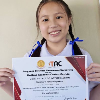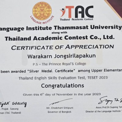 ที่ได้รับเกียรติบัตรเหรียญเงิน วิชาภาษาอังกฤษ ระดับประเทศ จากโครงการการสอบประเมินทักษะภาษาอังกฤษระดับประเทศ ครั้งที่ 4 (4th TESET – Thailand English Skills Evaluation Test )