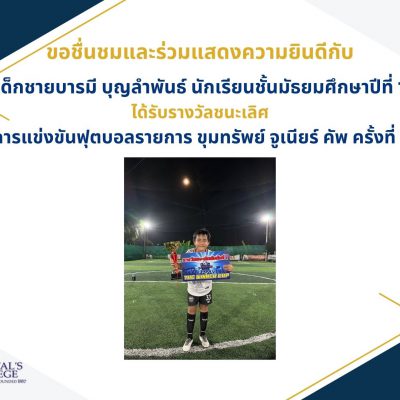 ขอชื่นชมและแสดงความยินดีกับ เด็กชายบารมี บุญลำพันธ์ นักเรียนชั้นมัธยมศึกษาปีที่ 1 ได้รับรางวัลชนะเลิศ จากการแข่งขันฟุตบอล รายการ ขุมทรัพย์ จูเนียร์ คัพ ครั้งที่ 1 รุ่นอายุไม่เกิน 12 ปี เมื่อวันที่ 26 พฤศจิกายน 2566