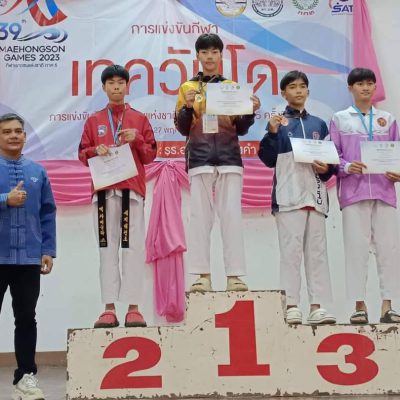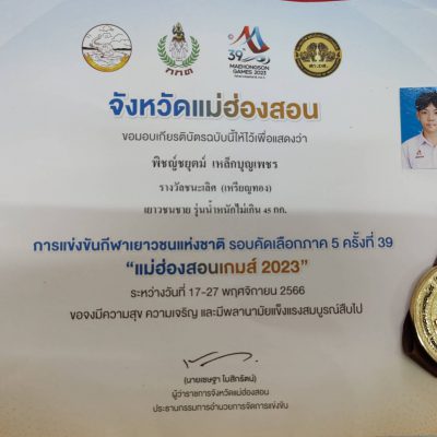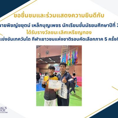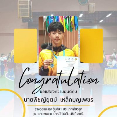 ขอชื่นชมและแสดงความยินดีกับ นายพิชญ์ชยุตม์ เหล็กบุญเพชร นักเรียนชั้นมัธยมศึกษาปีที่ 3 ได้รับ รางวัลชนะเลิศเหรียญทองกีฬาเทควันโด เยาวชนชายรุ่นน้ำหนักไม่เกิน 45 กก.ในการแข่งขันกีฬาเยาวชนแห่งชาติรอบคัดเลือกภาค 5 ครั้งที่ 39 “แม่ฮ่องสอนเกมส์2023” ระหว่างวันที่ 17 – 27 พฤศจิกายน 2566 และได้เป็นตัวแทนภาค 5 ไปแข่งกีฬาเยาวชนแห่งชาติครั้งที่ 39 จ. ราชบุรี