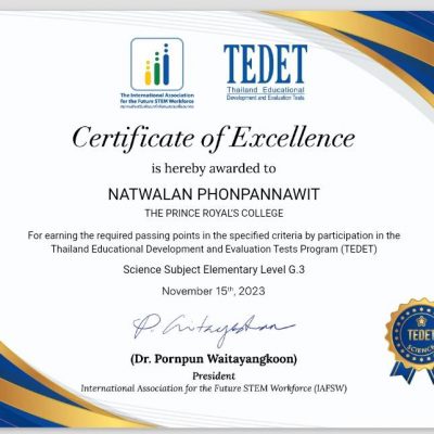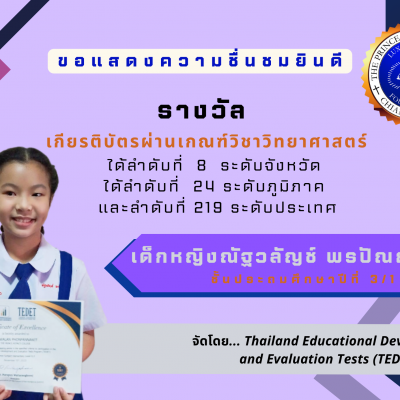 ขอแสดงความชื่นชมยินดีกับเด็กหญิงณัฐวลัญช์ พรปัณณวิชญ์ นักเรียนชั้นประถมศึกษาปีที่ 3/1 ได้รับรางวัลได้รับเกียรติบัตรผ่านเกณฑ์วิชาวิทยาศาสตร์ (ได้ลำดับที่8ระดับจังหวัด ลำดับที่24ระดับภูมิภาค และลำดับที่219ระดับประเทศ)ในการสอบโครงการประเมินและพัฒนาสู่ความเป็นเลิศทางคณิตศาสตร์และวิทยาศาสตร์ Thailand Educational Development and Evaluation Tests (TEDET) ปี พ.ศ.2566 จัดโดย Thailand Educational Development and Evaluation Tests (TEDET)