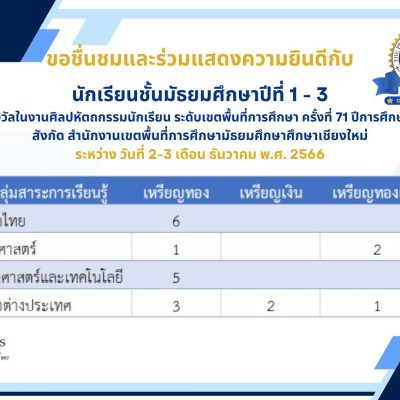 ขอชื่นชมและแสดงความยินดีกับ นักเรียนชั้นมัธยมศึกษาปีที่ 1 – 3 ได้รับรางวัลในงานศิลปหัตถกรรมนักเรียน ระดับเขตพื้นที่การศึกษา ครั้งที่ 71 ปีการศึกษา 2566 สังกัด สำนักงานเขตพื้นที่การศึกษามัธยมศึกษาศึกษาเชียงใหม่ ณ โรงเรียนยุพราชวิทยาลัย โรงเรียนวัฒโนทัยพายัพ โรงเรียนสันกำแพง โรงเรียนหอพระ โรงเรียนกาวิละวิทยาลัย และโรงเรียนดอยสะเก็ดวิทยาคม ระหว่าง วันที่ 2-3 เดือน ธันวาคม พ.ศ. 2566