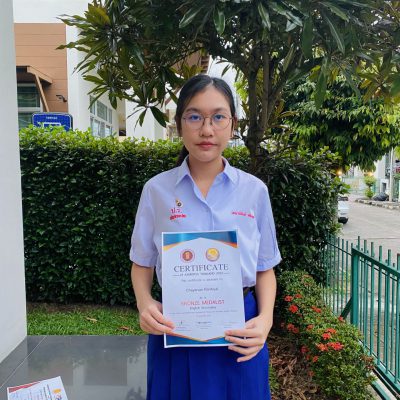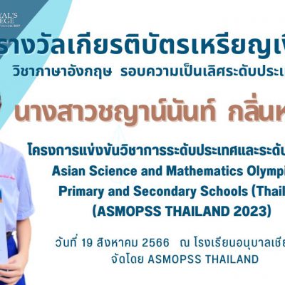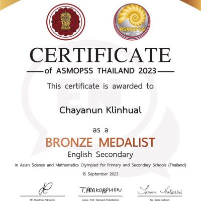 2) รางวัลเกียรติบัตรเหรียญเงิน วิชาภาษาอังกฤษ รอบความเป็นเลิศระดับประเทศ จากโครงการแข่งขันวิชาการระดับประเทศและระดับนานาชาติ Asian Science and Mathematics Olympiad for Primary and Secondary Schools (Thailand) ASMOPSS THAILAND 2023) เมื่อวันที่ 19 สิงหาคม 2566 ณ โรงเรียนอนุบาลเชียงใหม่ จัดโดย ASMOPSS THAILAND