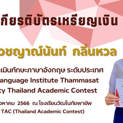 1) รางวัลเกียรติบัตรเหรียญเงิน จากโครงการประเมินทักษะภาษาอังกฤษระดับประเทศ ครั้งที่ 4 Thailand English Skills Evaluation Test (TESET) เมื่อวันที่ 20 สิงหาคม 2566 ณ โรงเรียนวัฒโนทัยพายัพ จัดโดย Thailand Academic Contest (TAC)