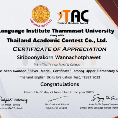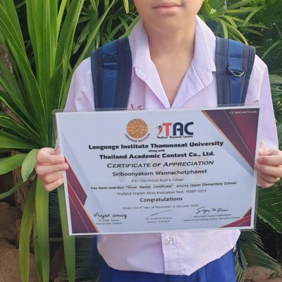 ที่ได้รับรางวัล เหรียญเงิน จากการสอบแข่งขันภาษาอังกฤษระดับประเทศ ครั้งที่ 4 Language Institute Thammasat University Thailand Academic Contest จัดโดย จัดโดย TAC (Thailand Academic Contest)