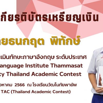 ขอชื่นชมและแสดงความยินดีกับ นายธนกฤต พิทักษ์ ม.4/3 ที่ได้รับเกียรติบัตรเหรียญเงิน จากโครงการประเมินทักษะภาษาอังกฤษระดับประเทศ (TESET) ครั้งที่ 4 เมื่อวันที่ 20 สิงหาคม 2566 ณ โรงเรียนวัฒโนทัยพายัพ จัดโดย ศูนย์สอบวิชาการ (ประเทศไทย) คอนเทสต์ สถาบัน TAC